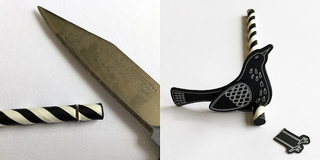 Save the waste circles cut from the birdhouse and adhere them to the ends of the trimmed straw. Then cut a slit in the straw with a serrated knife. Carefully trim the legs off the bird’s body and push the bird into the slit. A blob of adhesive behind the bird ensures that the bird stays in place. Once dry push the perch through the holes in the assembled birdhouse and add more adhesive at the entry points to keep the perch in place and the bird upright.
