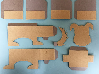 Cut all pieces from the Box1 file, and the leg reinforcement pieces from the Box 2 file in Silhouette Chipboard. Cut selected pieces from the Terrier file (I cut the head twice, and one set of those fabulous eyebrows).