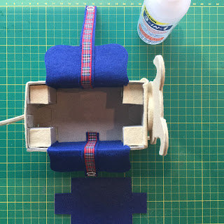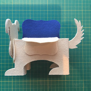 Make a sausage of stuffing wrapped in wadding and wrap a piece of blue felt around it. Secure along the length and at the ends with liquid adhesive. Cut a rectangle of board to fit the dog’s back and cover in blue felt, securing with glue. (Optional) Trap some thin ribbon to form a handle between rectangle and ‘sausage’.